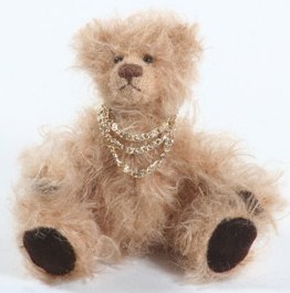 What a lady! Faerie Queen is a very dignified miniature teddy bear made from pale beige longpile mohair. She has dark brown paw pads, a serious, stitched mouth and nose and she is wearing a gold chain effect necklace befitting a bear of her standing!