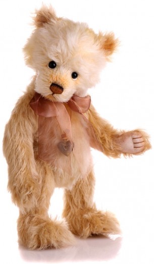 Charlie Bears' Lemon Popsicle is a sweet teddy bear made from the finest mohair fur in cream and golden yellow, with a warm backing that shows through on her trimmed muzzle. She is fully jointed and can stand alone on her flat paws. Lemon Popsicle has gorgeous big, dark eyes & a shiny stitched nose and she wears a pale brown ribbon and pretty vintage-style necklace.