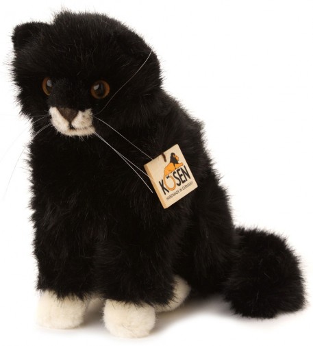 Kosen's 'Edward' Tom Cat is available in both black and black & white. This cat is black and white, with glossy black fur and white socks and face. He has pale amber pupil eyes, a pink nose and long whiskers. He is softly stuffed with some pellet filling for a cuddly and flexible feel.