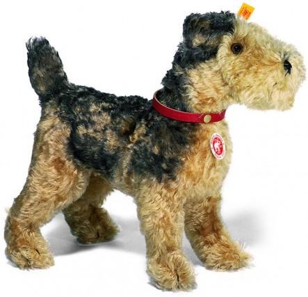 Steiff's Classic 1935 Fellow Terrier is a fantastic recreation of an Airedale Terrier dog made in 1935. He is made from the finest, soft mohair in black and tan, with bright amber pupil eyes and a black doggy nose. He stands proudly on all fours and wears a smart red, genuine leather collar.