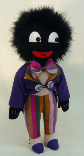 Made from shell pink and purple ultrasuede, his jacket is fastened with two crystal buttons. His trousers and bow tie are of multi-coloured silk and he has black safety eyes.