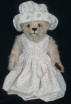 Anne teddy bear is made from rather sparse, golden blond mohair with hessian paw pads. She is filled with a combination of traditional wood wool, polyester and steel shot for a good weight. Anne's cute outfit of peach hand-knitted cardigan and hat has been hand-made for her by Iris.