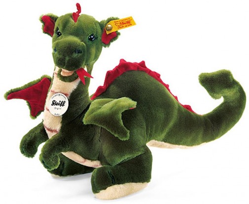 Steiff's Rocky Dragon is the big daddy! (Here is his little Raudi Dragon Boy) He is made from dark green woven plush fur, with a pale tummy featuring an airbrushed scale effect. His wings are lined with deep red fabric, matching his spiny back and inner ears. He has a forked tongue but he won't set your sideboard alight!