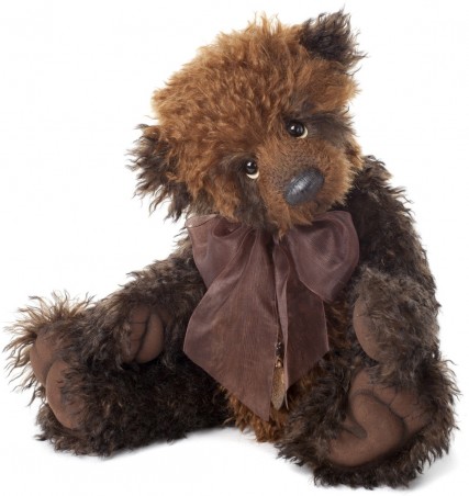 Dufous has fantastic fur with such a strong wave that it almost looks like he's been at the crimpers! His mohair fur is deep brown and hazel, and he has soft, sculpted paw pads with tickly toes. Dufous has a stitched and waxed nose and dark, soulful eyes. He wears a wide organza ribbon and a beaded necklace with a heart pendant.