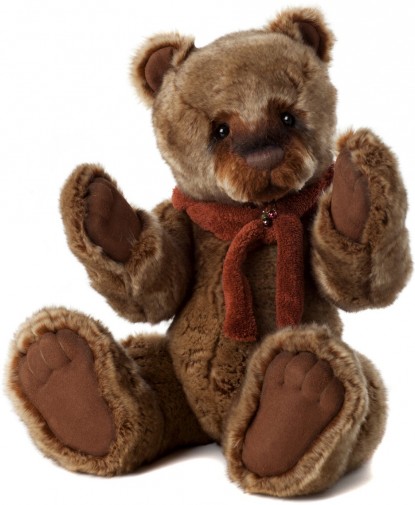 Henry from Charlie Bears is a chunky chap with a smooth, soft coat of warm brown plush fur with lighter beige patterning. The darker colour can be seen on his carefully trimmed muzzle and face, which shows off his dark, sparkly eyes and brown hand-stitched nose. Henry wears a cuddly plush scarf, secured with coloured beads.