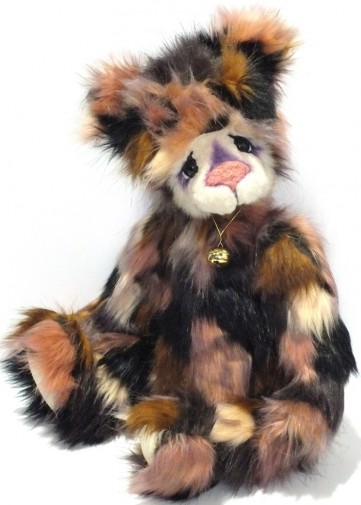 Kaycee Bears' Gypsy is a BIG bear - you'll either need plenty of space...or just evict someone else from the settee! She is made from a fantastic plush fur, made from big tufts of dark purple, black, brown, dusky pink and cream. Her legs are bent which makes her especially good at sitting on the edge of a shelf or chair. Gypsy has cashmere paw pads and a dusky pink nose, with purple shading to her face. She wears a shiny jingle bell on a cord.