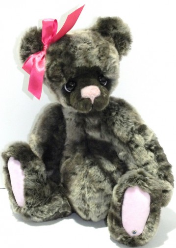 Kaycee Bears' Annie is a partner for last year's Arthur bear. Annie is made from a soft and glossy plush fur which is dark grey, with silver tipping. She has pale pink cashmere paw pads and needle-felted nose - perfectly offset with a hot pink bow in her hair! Arthur will be very pleased!