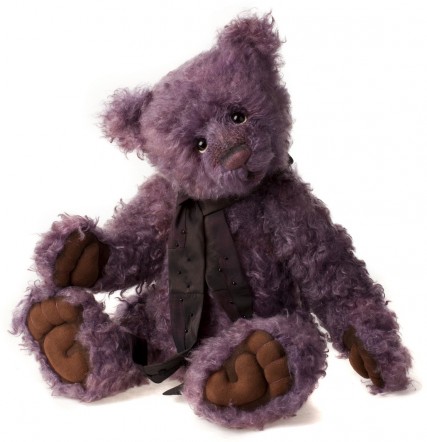 Buster has a brilliant coat of wavy, mauve mohair and contrasting brown ultrasuede sculpted paw pads complete with tickly toes! He has a bold hand-stitched nose and felt backed eyes that give him an endearing expression. He wears a deep purple fabric scarf, with tiny beads.