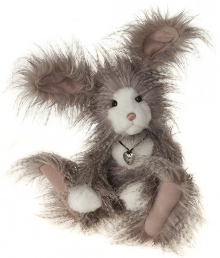 Charlie Bears Tangle Bunny Rabbit is such a character! He's made from a fabulous, long pile plush with patterned tipping that gives the fur a feather effect. His bib, face and front paws are soft white plush and his paw pads and ears are lined with brown ultrasuede. Tangle has a serious little face, with a neat, peach-coloured hand stitched nose and dark eyes. He wears a pretty filigree heart pendant.