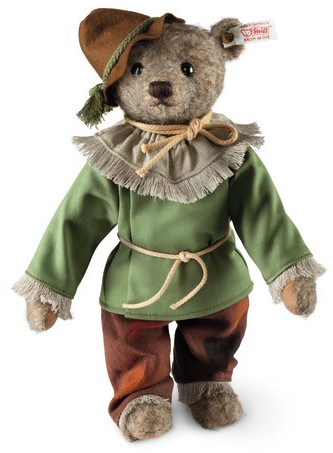 Steiff's Scarecrow Teddy Bear is the latest in a series of Wizard of Oz teddy bears, including the Cowardly Lion and Dorothy. He's made from cuddly antique caramel mohair, with beige paw pads and wears a simple outfit of brown cotton trousers and green smock with beige trim and tied with string!