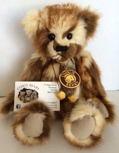 Cute Tickle teddy bear from Charlie Bears has a mixed up coat of cream, beige and brown, so no two will be exactly the same! He has soft paw pads of grey suedette and a hand-stitched nose. He wears a cute beaded necklace.