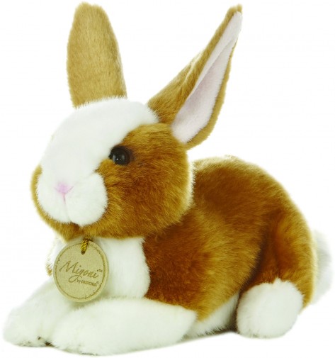 A cuddy plush bunny with a soft coat of brown and white.