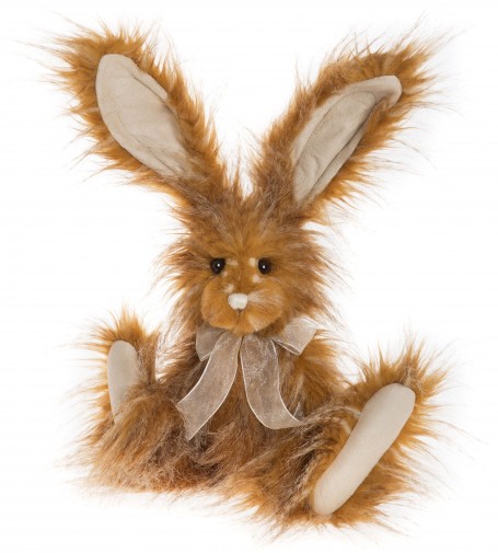 Dell rabbit has long, soft, golden plush fur, with lots of light tipping and this has created a spotted effect on the shaved muzzle. She has a small, hand-stitched nose, dark eyes, big feet and her ears are wired for poseability. She wears a delicate organza ribbon.